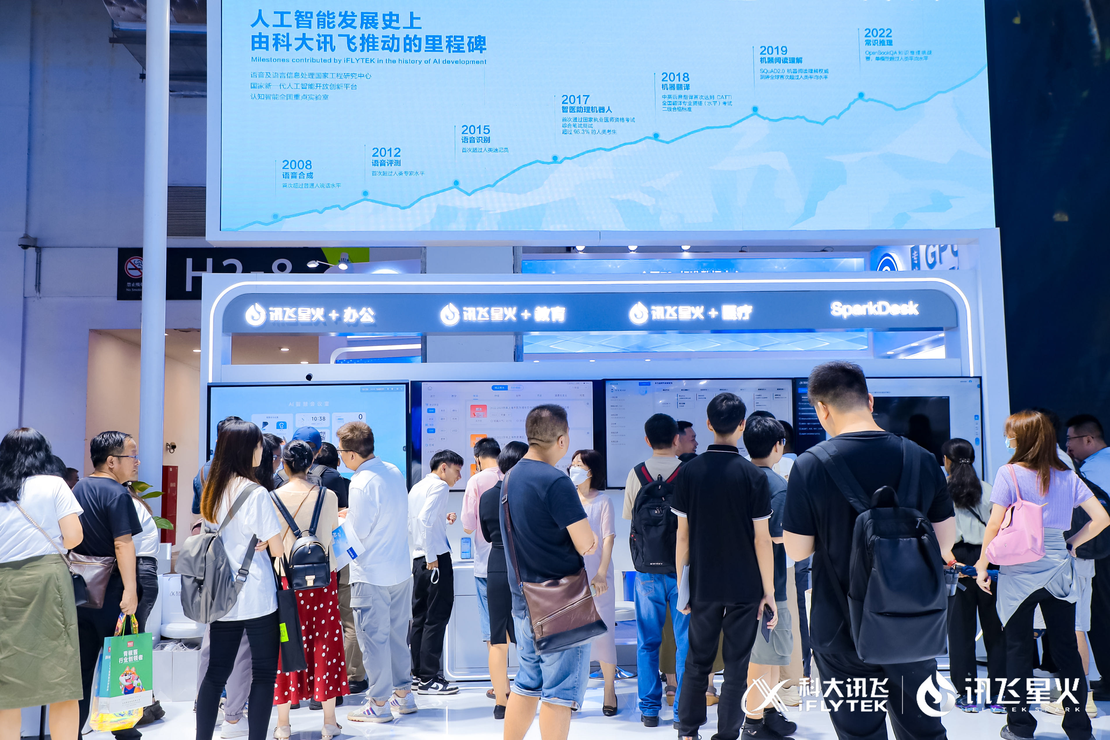 此外,架构在国产软硬件基础之上的星火大模型也在AI大模型技术专区和华为昇腾生态展区同步展出,展示星火认知大模型赋能各行各业的多元生态,让更多与会嘉宾感受国产大模型的魅力。